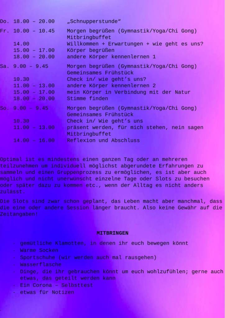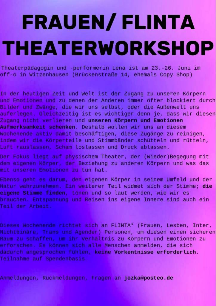 Am Samstag findet außerdem ein FLINTA Theaterworkshop im Zeichensaal von 9:00 bis 20:00 Uhr statt!